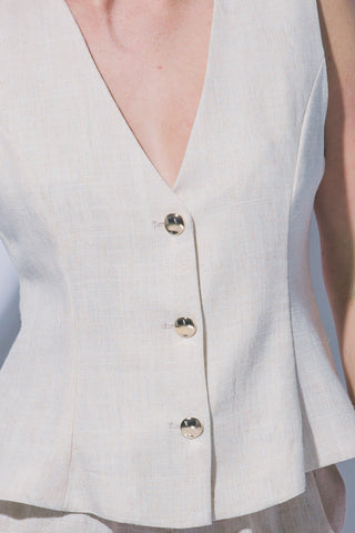 CARACTERÍSTICAS- Escote en V, Cierre de Botones, ChalecoESTILO DEL CONJUNTO: 60100PN- La modelo usa talla pequeña 55% RAYÓN, 30% POLIÉSTER, 15% LINO