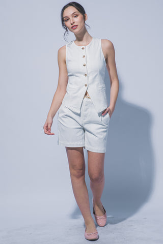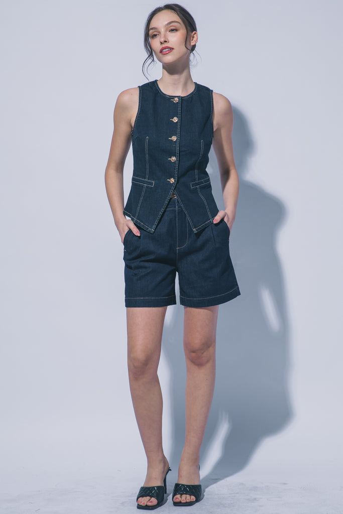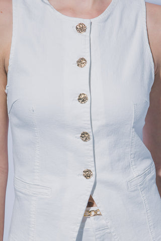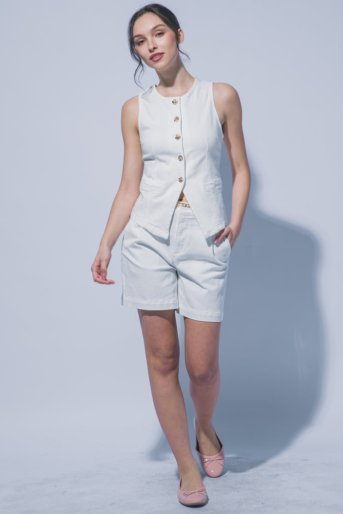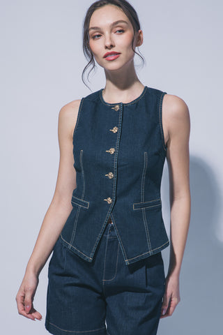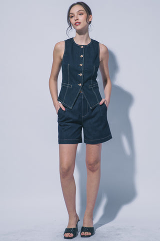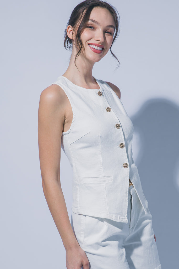 CARACTERÍSTICAS- Bolsillos ribeteados, sin mangas y cierre de botónESTILO DEL CONJUNTO: 60097PL- La modelo lleva la talla Pequeña