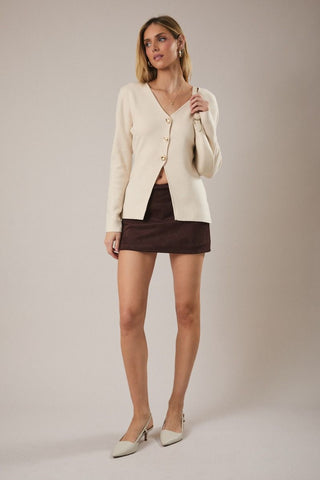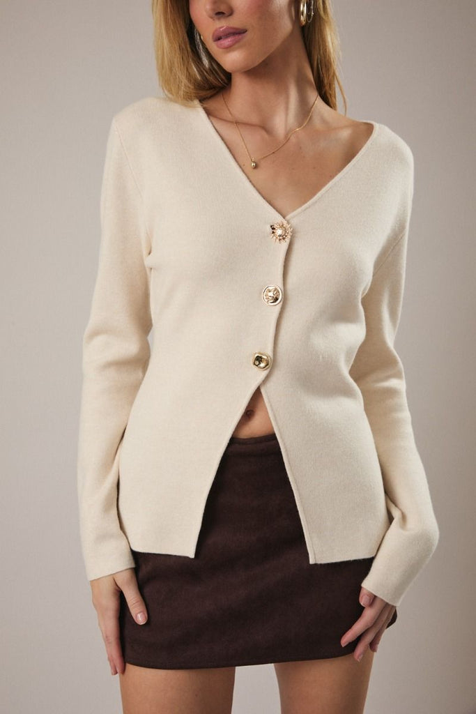 - Estilo: Suéter de punto con botones frontales.