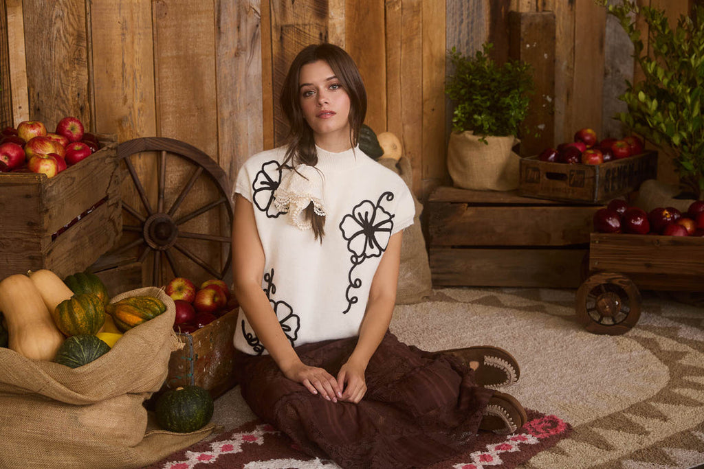 suéter sin mangas mujer, suéter cuello alto, suéter floral, suéter crema, knit pullover, suéter elegante, suéter romántico, outfit otoño invierno, chaleco tejido, moda femenina.