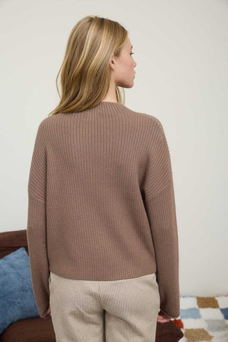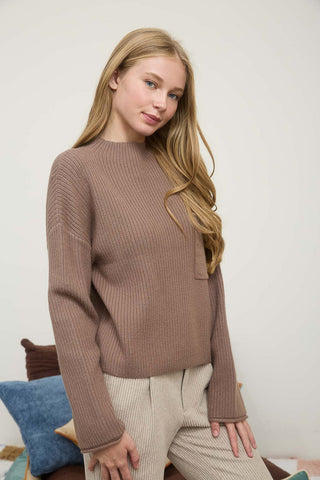 Un básico moderno y versátil para tu clóset. Este suéter tipo pullover combina un cuello mock con mangas largas y hombros caídos para un look relajado y elegante. El detalle del bolsillo en el frente le da un toque único y práctico, mientras que su tejido acanalado lo hace cómodo y sofisticado.