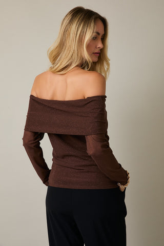 Blusa Cafe off shoulder de manga larga con brillo para mujer | Top elegante ajustado color café metálico