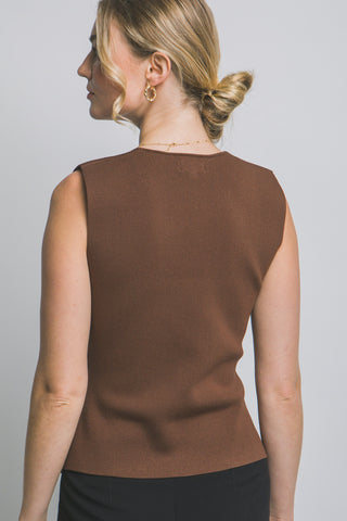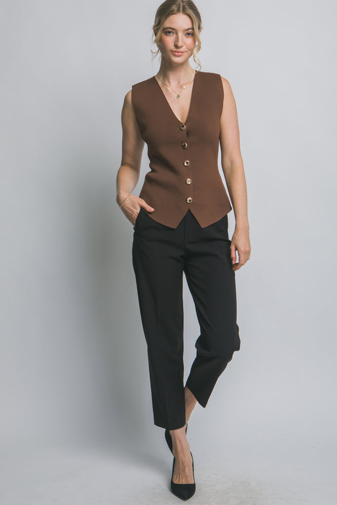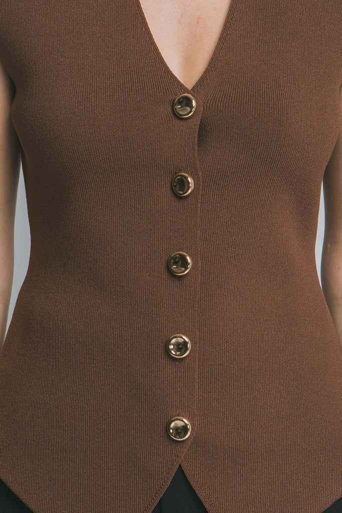 Este chaleco sin mangas tejido con botones dorados frontales es una prenda versátil que puedes usar tanto en un look elegante como casual. Su corte ajustado realza la silueta y su diseño con escote en V aporta un toque refinado.
