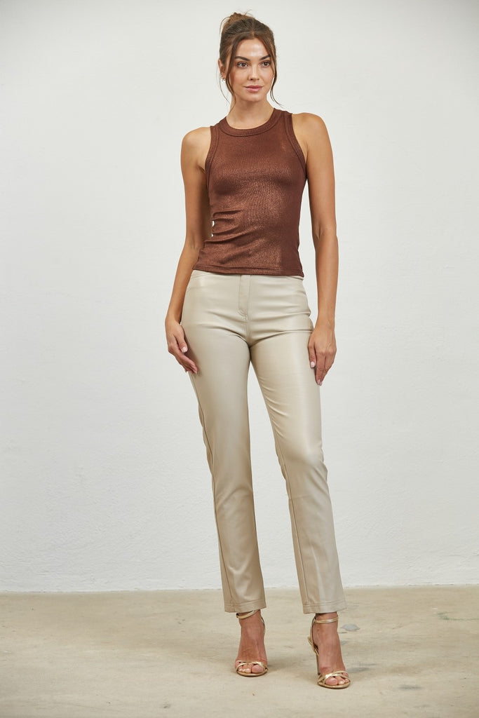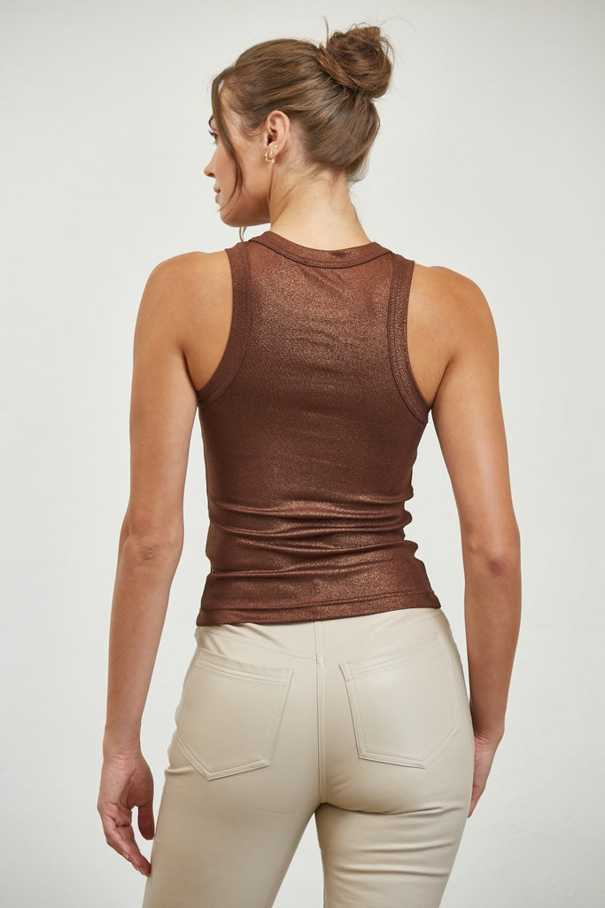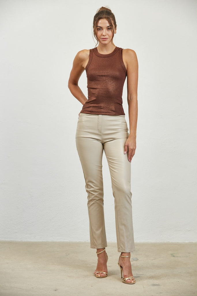 Un básico moderno con un toque brillante. Este top tejido en acabado metálico ofrece un ajuste ceñido y favorecedor, ideal para usar solo o en capas bajo un blazer o chaqueta. Su diseño sin mangas y cuello redondo lo convierten en una prenda versátil que transita fácilmente de looks casuales a outfits de noche.