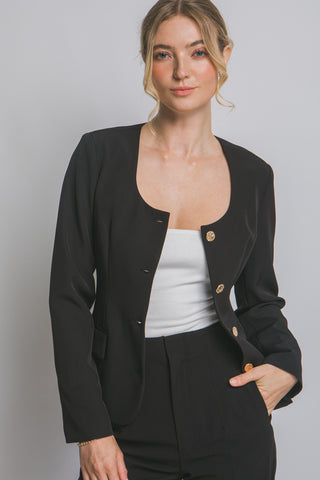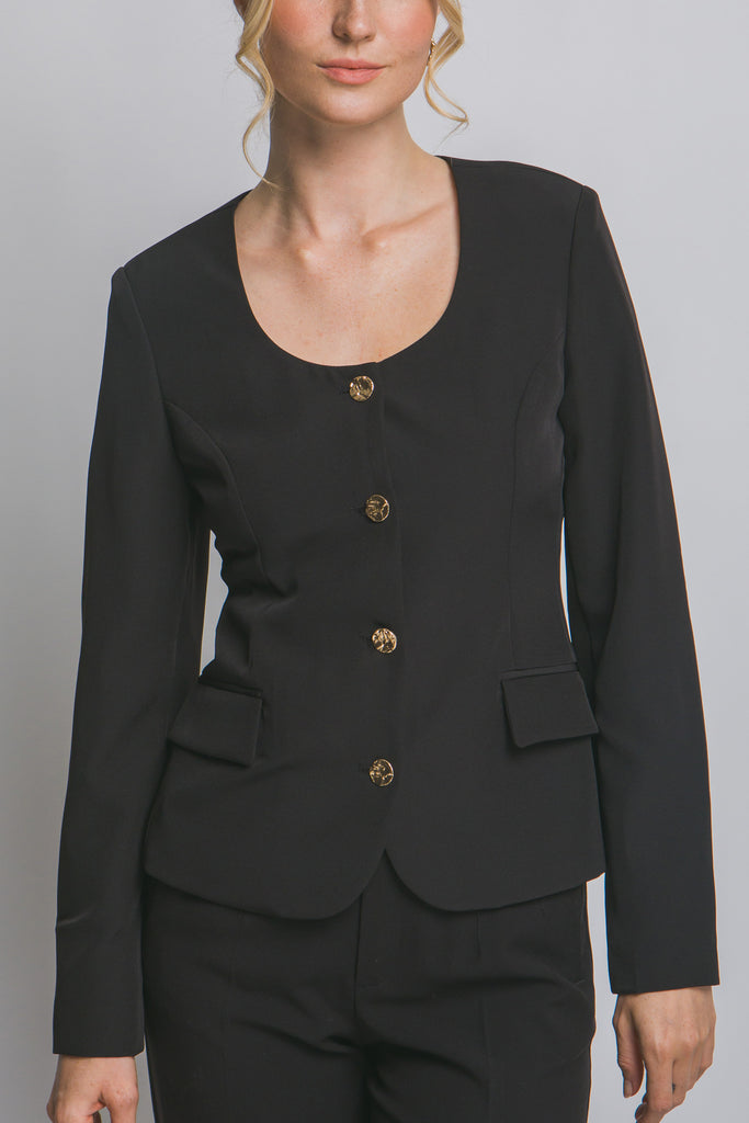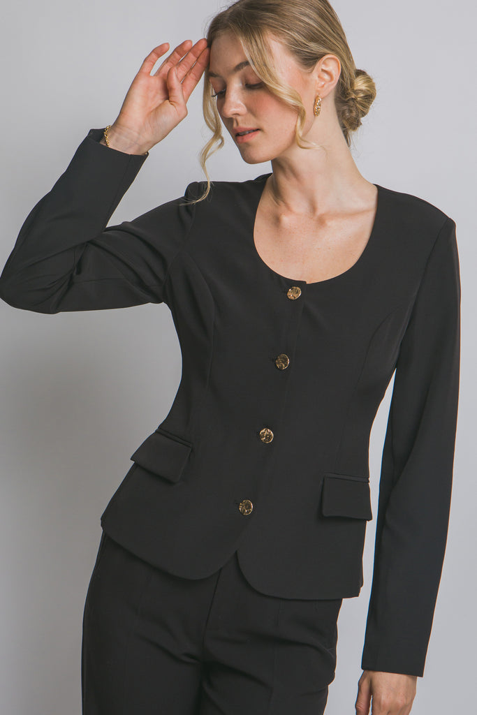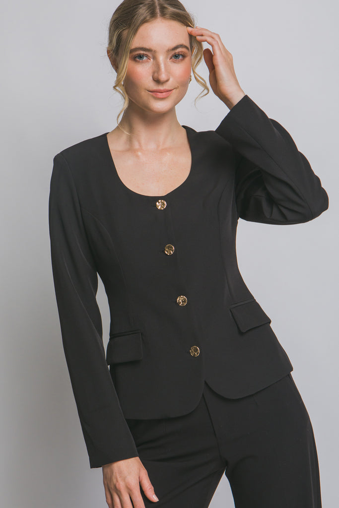 Blazer de dama sofisticado, perfecto para cualquier ocasión. Diseñado con un elegante escote scoop y botones dorados frontales que añaden un toque de lujo. Cuenta con prácticos bolsillos de ojal y mangas largas. Confeccionado en una mezcla de 95% poliéster y 5% spandex, este blazer ofrece un fit entallado que realza tu figura, brindando comodidad y estilo. Ideal para llevar en la oficina, eventos formales o para elevar tu outfit diario. ¡Siéntete confiada y a la moda!
