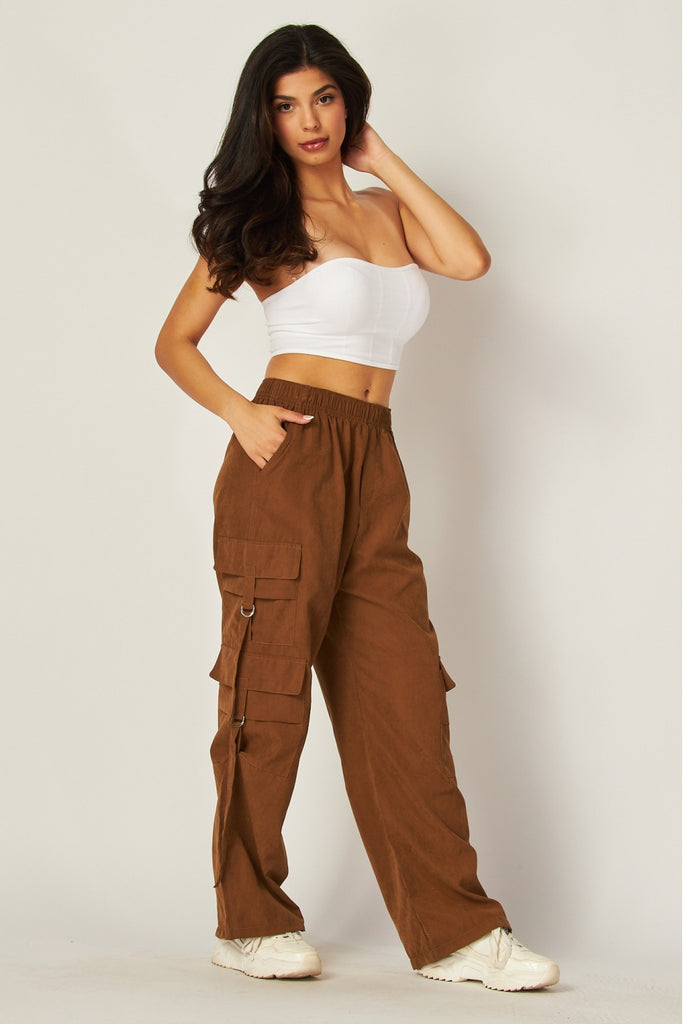 Luce moderna y cómoda con este pantalón cargo confeccionado en suede vegano ligero (100% poliéster), que imita la suavidad del cuero y aporta un toque elegante a un estilo urbano. Su diseño holgado y los múltiples bolsillos lo hacen ideal para un look casual, streetwear o de viaje.