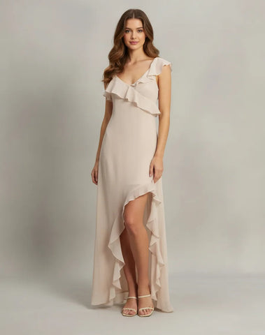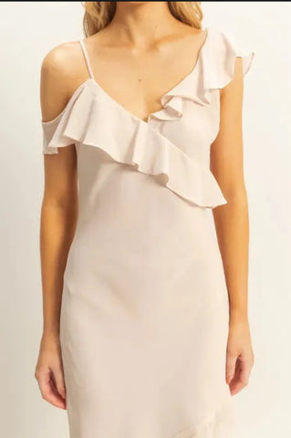 Luce elegante y moderna con este vestido midi negro de diseño asimétrico. Confeccionado en un tejido ligero que realza la silueta, presenta un delicado escote con tirantes finos y detalles de volantes que aportan un toque romántico y femenino. Su corte asimétrico con abertura en la pierna crea un movimiento sofisticado y estilizado, ideal para destacar en cualquier ocasión especial, desde cócteles hasta cenas formales. Combínalo con sandalias de tacón para un look de impacto.