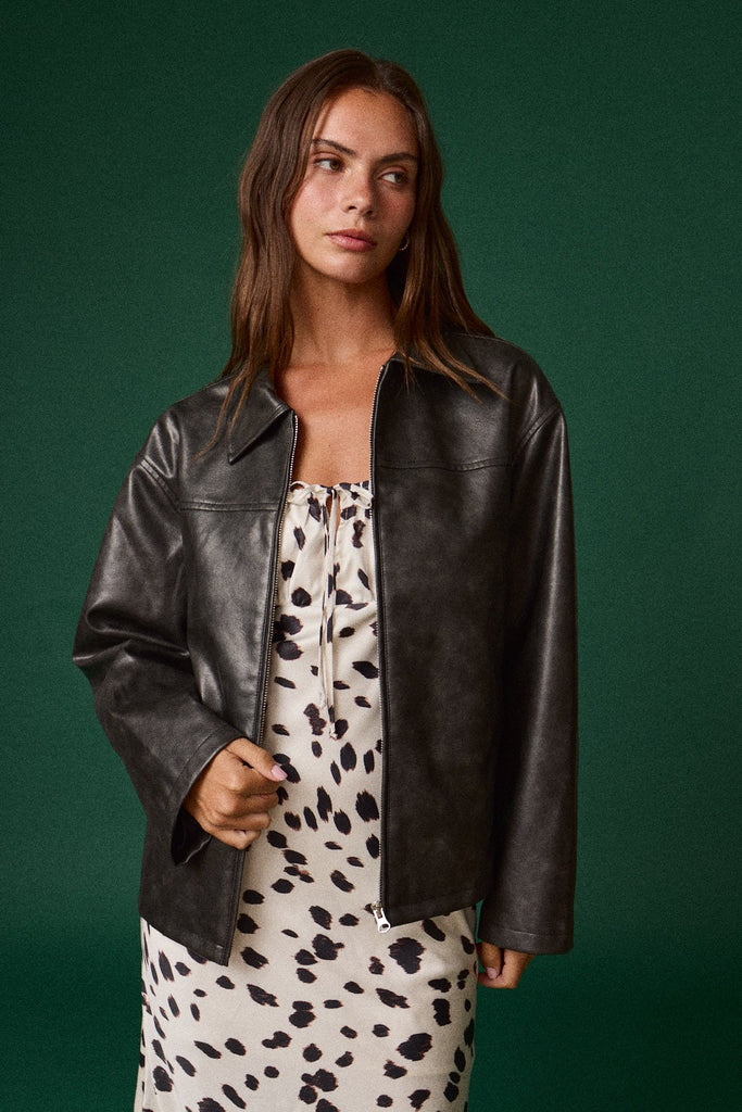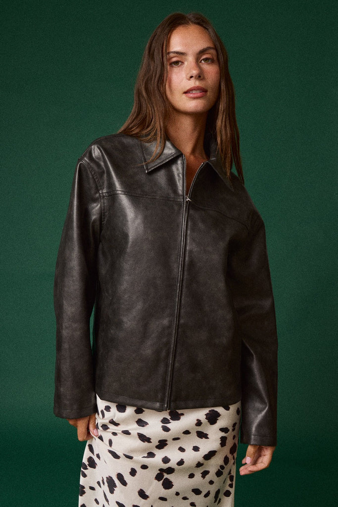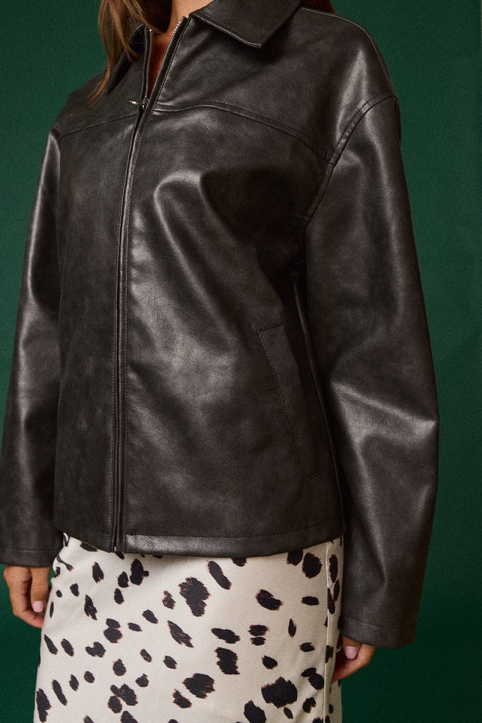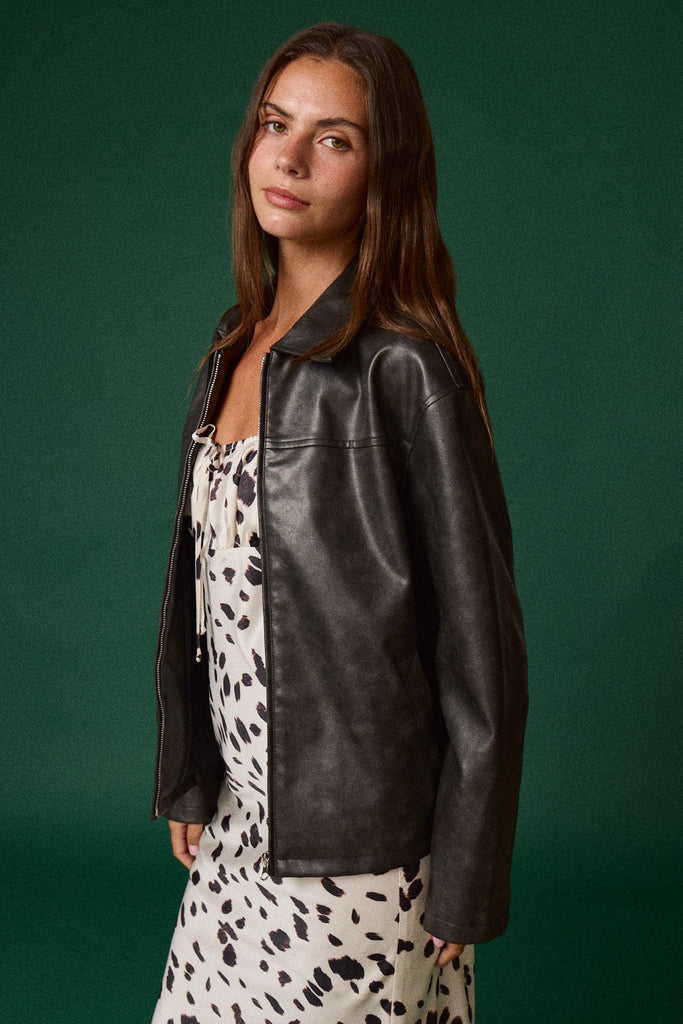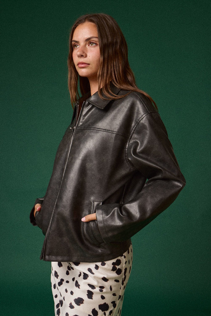 Haz una declaración de estilo con esta chaqueta oversize de cuero sintético, diseñada para las chicas que aman un look moderno y con actitud. Su corte relajado y textura tipo cuero le dan un toque street chic que transforma cualquier outfit en un look de impacto.