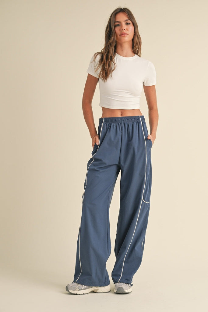 Pantalones deportivos de nailon, estilo moderno y deportivo. Vivos contrastantes y bajos ajustables con cordón. 92% nailon, 8% spandex. Largo interior: S: 76 cm; M: 77 cm; L: 78 cm.
