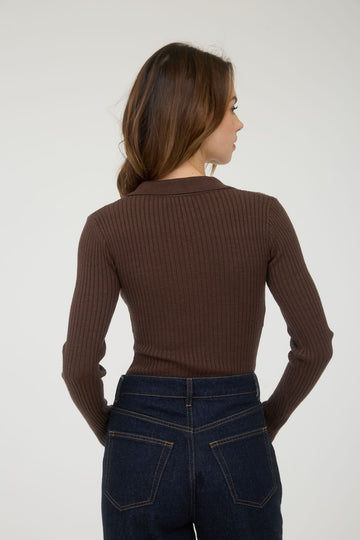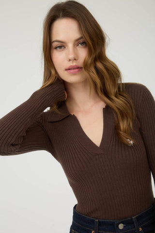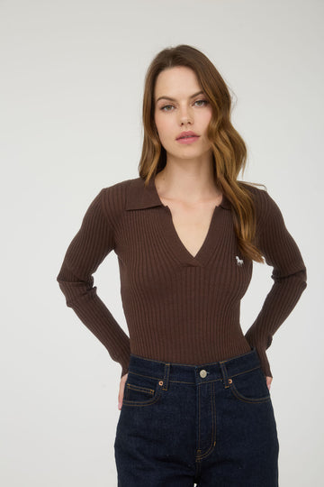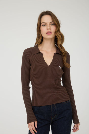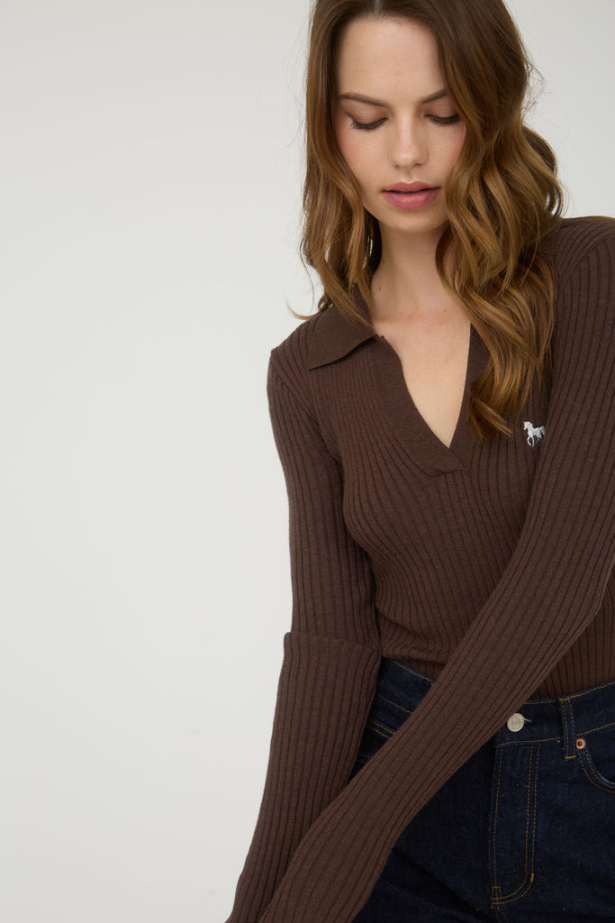 Un básico elegante con un toque distintivo. Este polo tejido de manga larga combina un diseño ajustado con un escote en V con cuello camisero, que estiliza la silueta y aporta un aire sofisticado. El bordado del caballo en el pecho añade un detalle sutil pero único.
