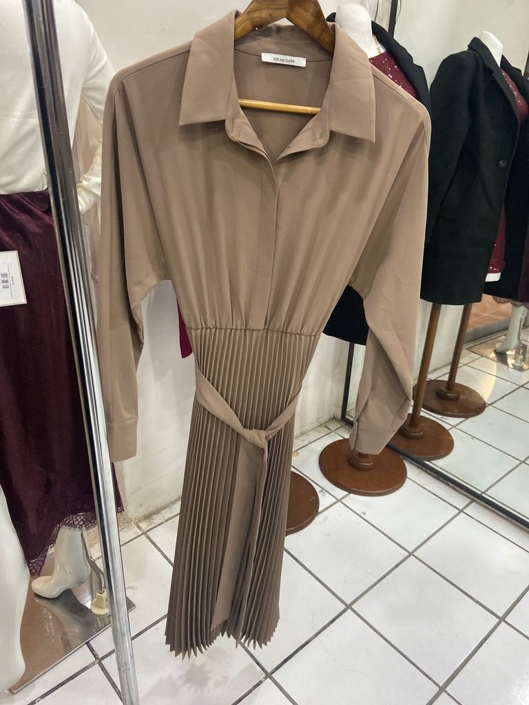 Vestido café manga larga tela plisada
