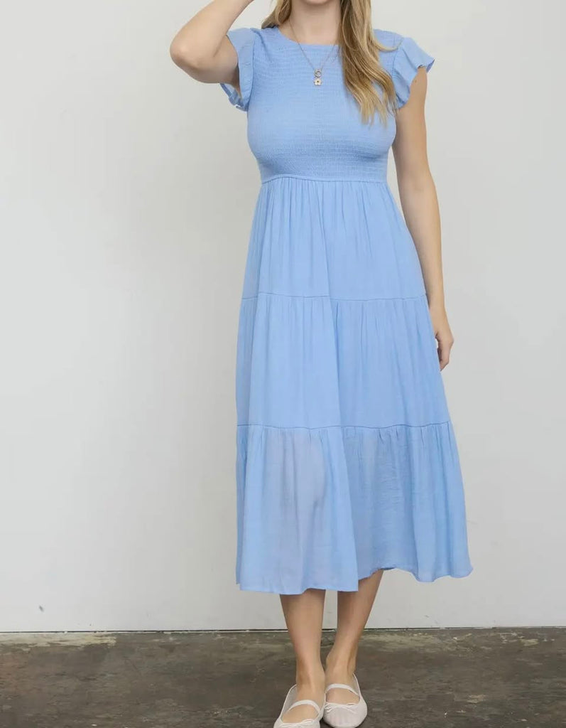 Romántico, fresco y absolutamente femenino. Este vestido midi en azul celeste es la pieza que toda mujer necesita en su guardarropa esta temporada. Su delicado cuerpo fruncido (smocked) se adapta naturalmente a la figura, mientras que la falda por niveles fluye con cada movimiento creando una silueta suave y envidiable.